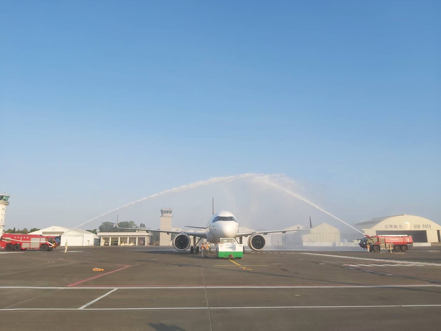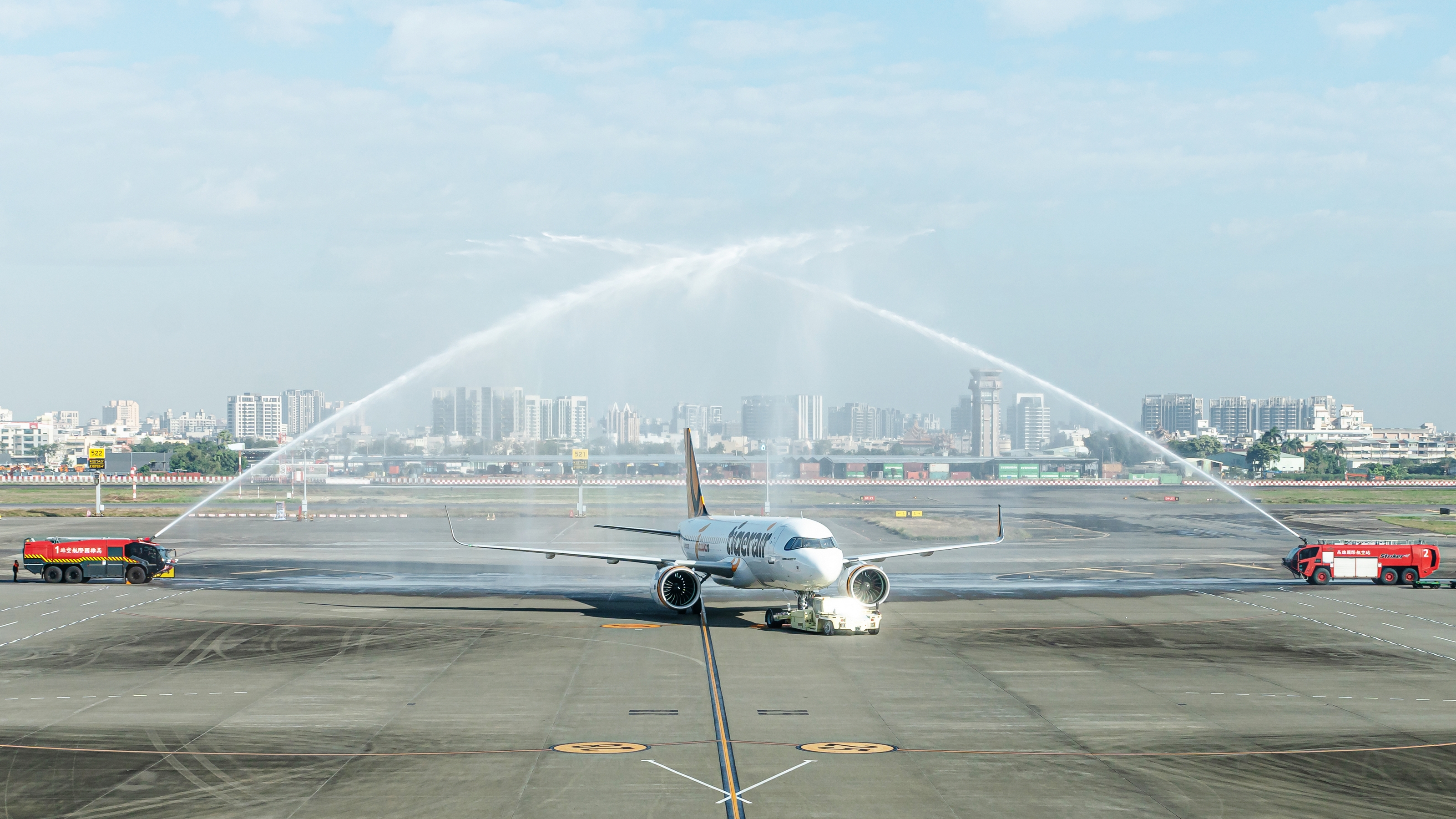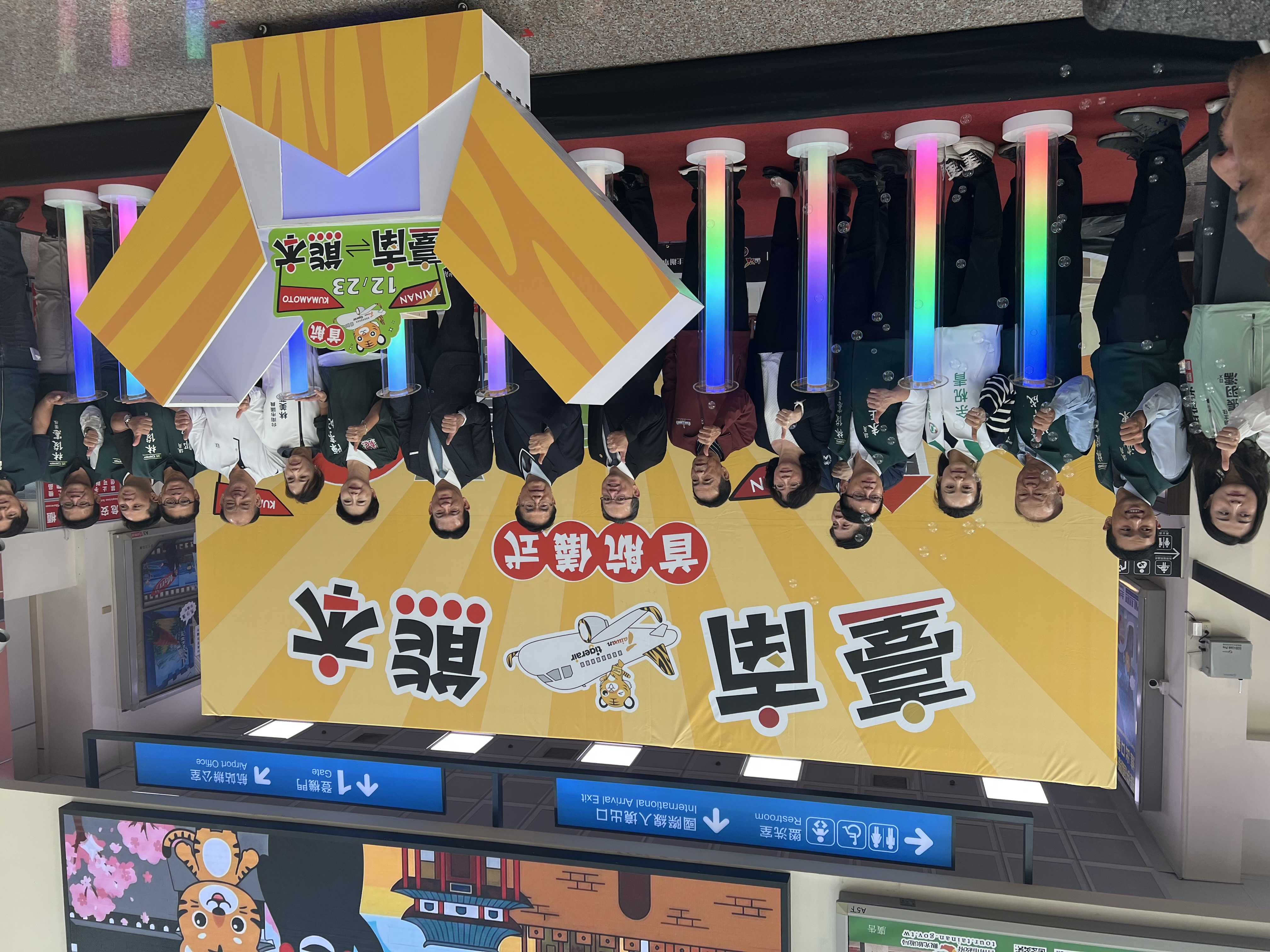 在台南市長黃偉哲、立法委員林俊憲、陳亭妃、民航局長何淑萍與台灣虎航商務長許致遠共同見證下,台虎今天首航台南—熊本航線;不遠處,台虎高雄—熊本也在今天首航,站方特別準備「水門禮」慶賀,台虎董事長黃世惠與立法委員許智傑也陪著旅客搭乘首航班機前往熊本。